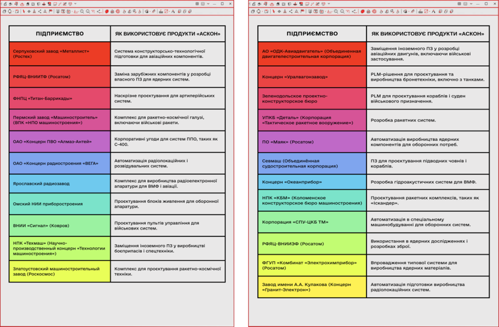 На той момент компанія вже була залучена до оборонно-промислового комплексу Росії, який у значних масштабах виробляв зброю для війни проти України. Ось перелік конкретних прикладів роботи АТ «АСКОН» у цій сфері: