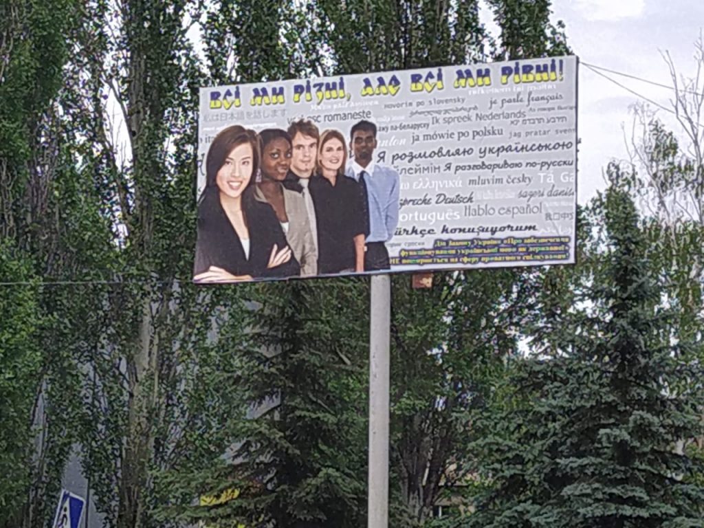 До слова, в Донецькій області почали з’являтися білборди, які символізують рівність всіх національностей світу та вільного спілкування будь-якою мовою у побуті. Ось один із таких прикладів: