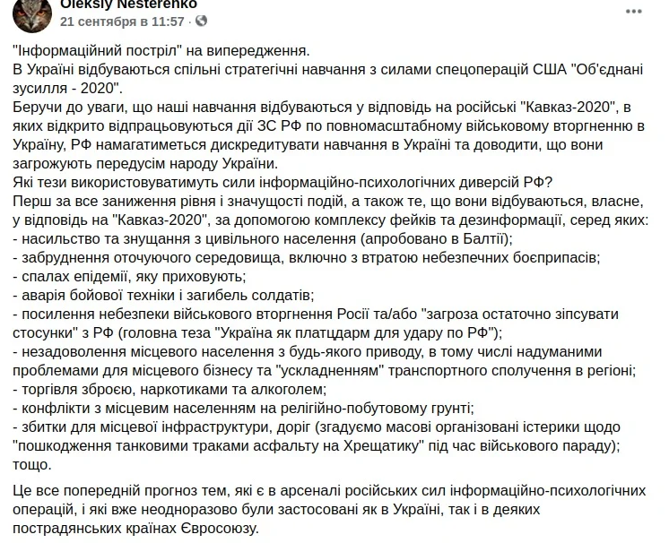 21 вересня український блогер Олексій Нестеренко опублікував на своїй сторінці у Facebook пост “Інформаційний постріл на випередження”, у якому попередив, що РФ спробує дискредитувати українсько-американські навчання Rapid trident-2020.